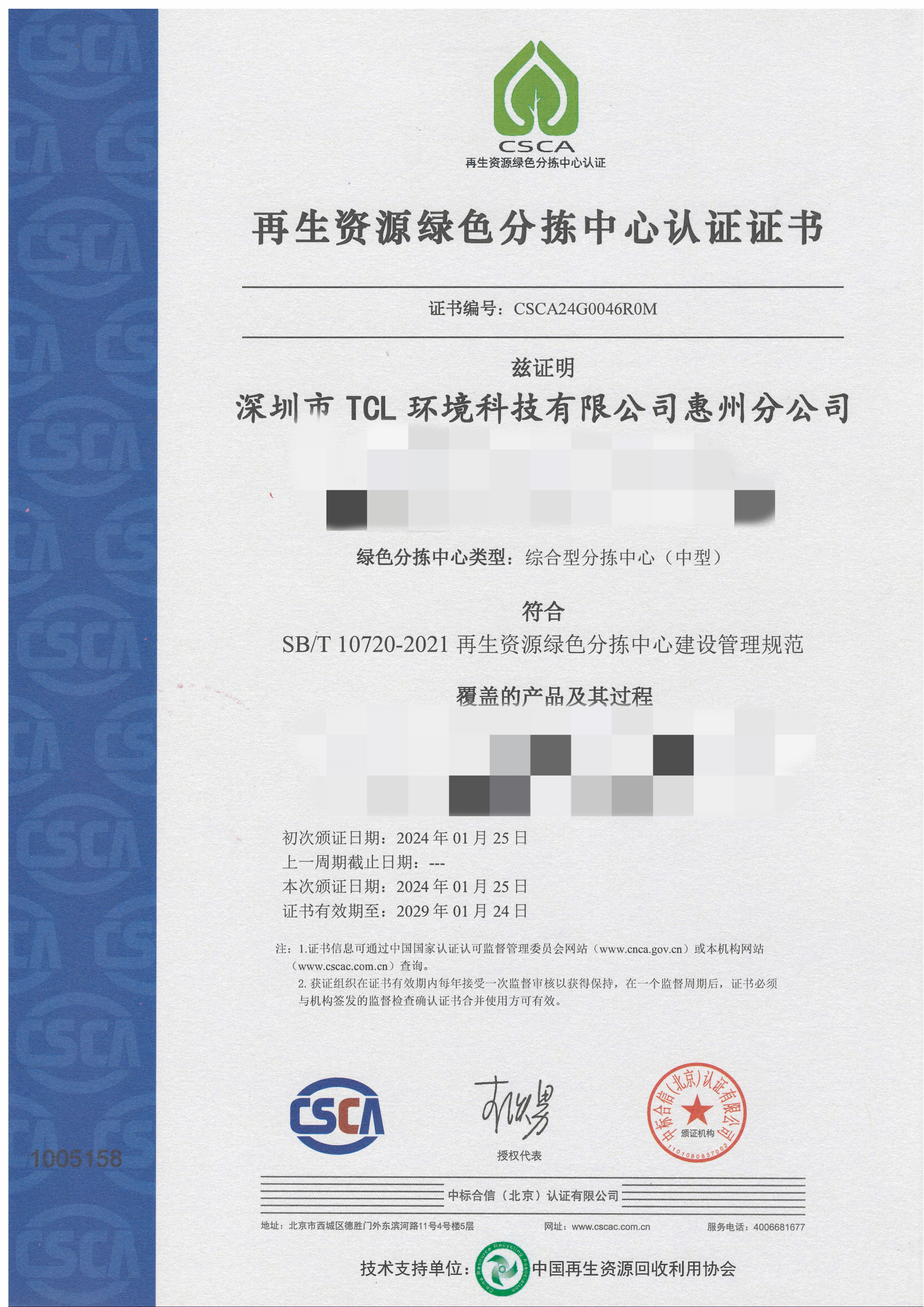 近日,深圳市TCL环境科技有限公司惠州分公司(以下简称深圳环科)顺利通过商务部行业标准《再生资源绿色分拣中心建设管理规范》(SB/T10720-2021)第三方认证,获得再生资源绿色分拣中心认证证书,证书编号为CSCA24G0046ROM。