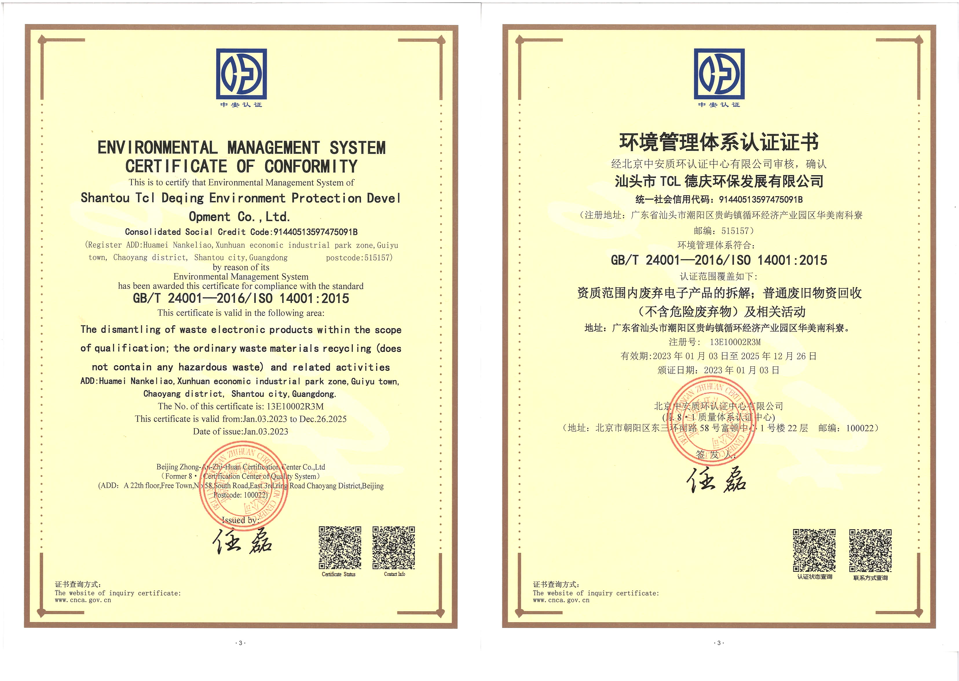 环境管理体系认证证书